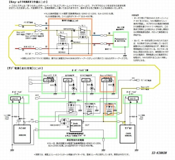 ・キーオフ時にNAVIのオーバーヘッドSWを入れると、NAVI電源SWリレー接点が導通し、サブBTからの電源が黄色線から装置を通りNAVIへ供給され、またこの時、同時に図の上のRL1が作動し車側からの常時電源を遮断、代わって黄色線から供給する。