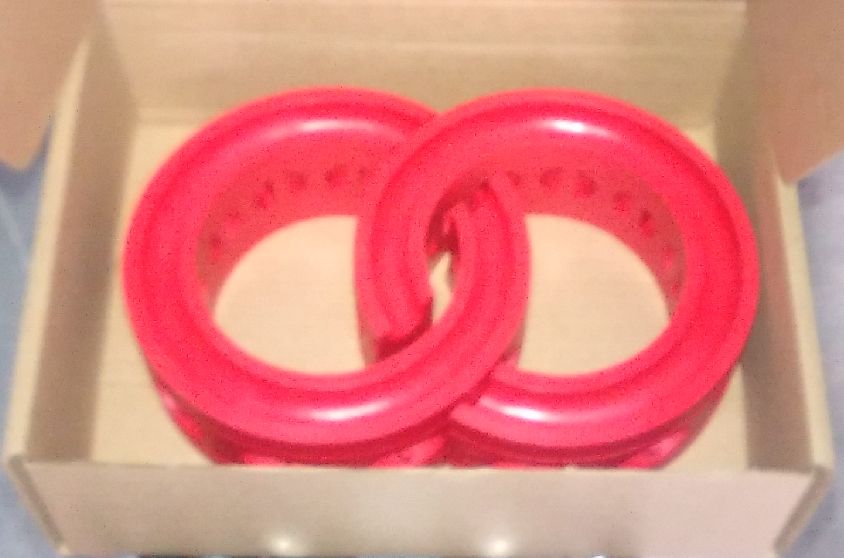 「車高を上げたい場合、 ジャッキアップしてスプリングが伸びた状態でゴムを入れるので下がりにくくなり車高が上がる。 ジャッキアップせず通常の状態では、そのまま線間にゴムが入るので、ショックが軽減され乗り心地が良くなる。 」