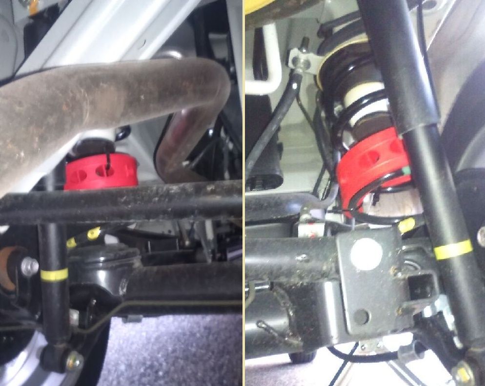 アップすると輪間がゆるゆる、、、なのでインシュロックで左右とも上下計5カ所止めています。これだと、コイルがゴムにはまり込んでいなかった部分も、ジャッキを下げるとちゃんと収まり、U型溝の方が良かったかもね。