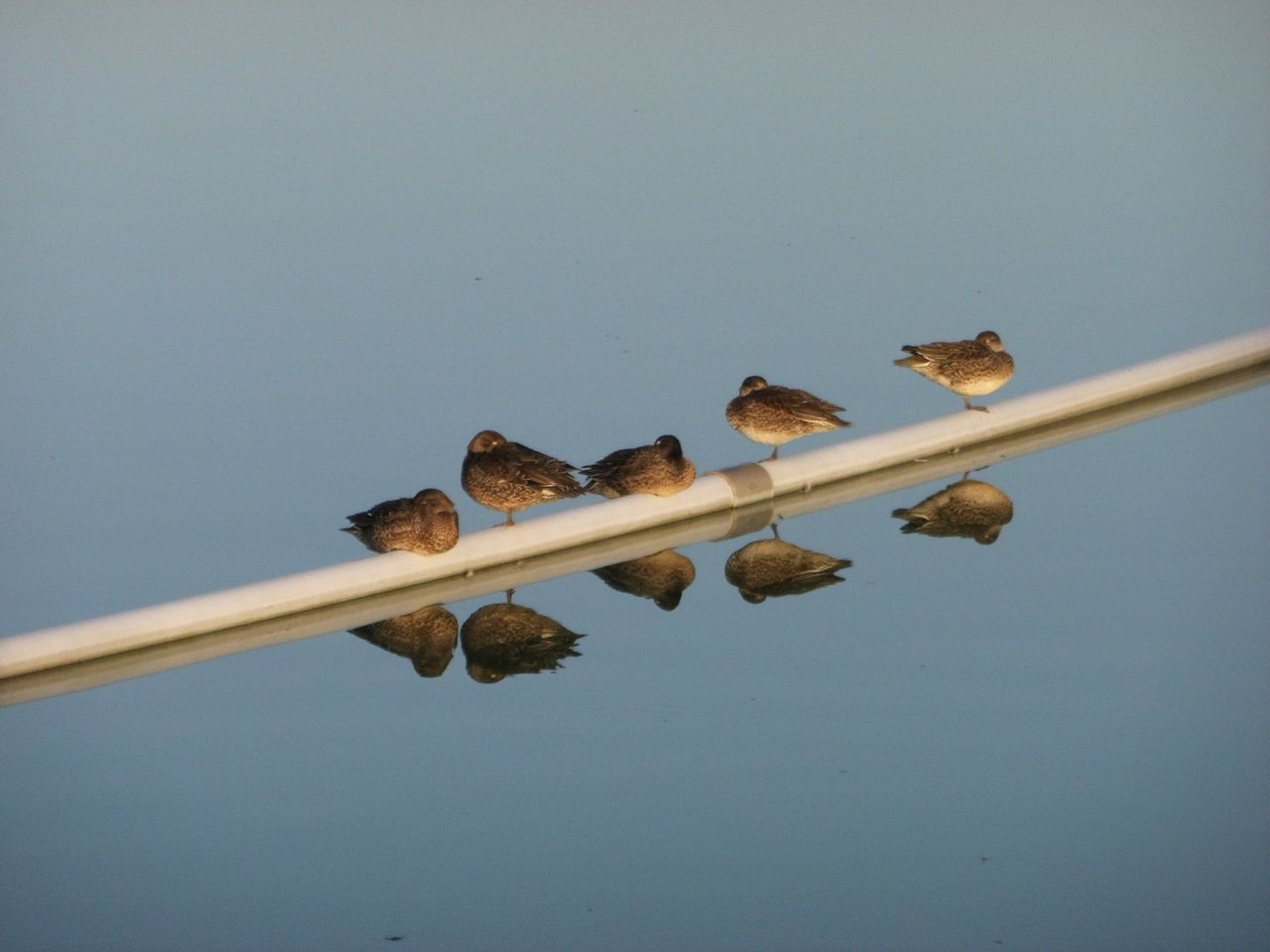 空中の止まり木?? 水上の木でおやすみしているカモたちです。
