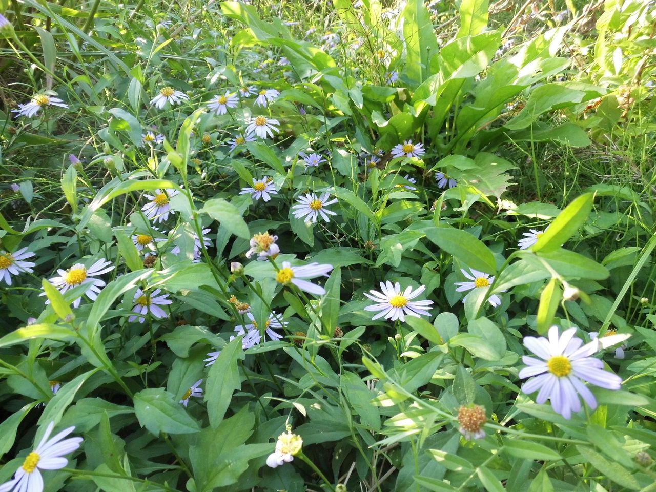 ノコンギク(野紺菊) 日が傾き日陰になると花びらが閉じる花が有りますが、この先の日陰の野菊は一様に、力を抜いたかのように、少し傘様に花びらが垂れているように見えました。このようになるのか調べましたがその記載は見つかりませんでした。