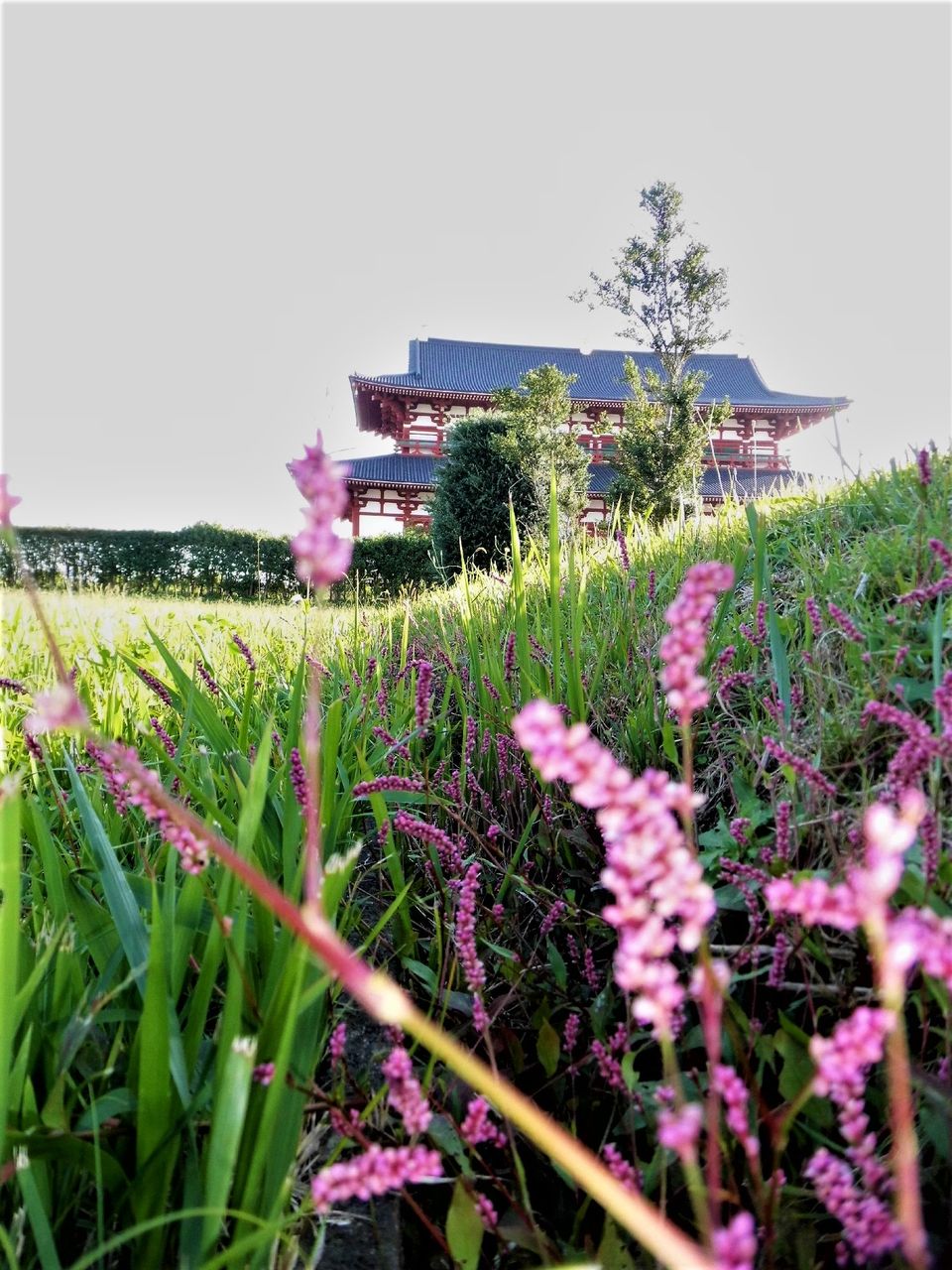 図西側(左側)の進入路から朱雀門に向かう道の両側には草原が広がっています。虫や鳥たちの鳴き声に癒やされます。そして、タデの仲間の野草も多い所。