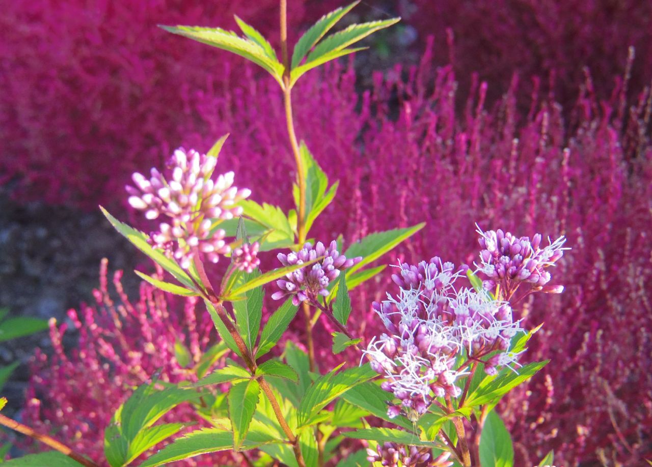 🔸 池の方向に進むと、道端の囲いの中に鮮やかなホウキギ(箒木)とフジバカマ(藤袴)。