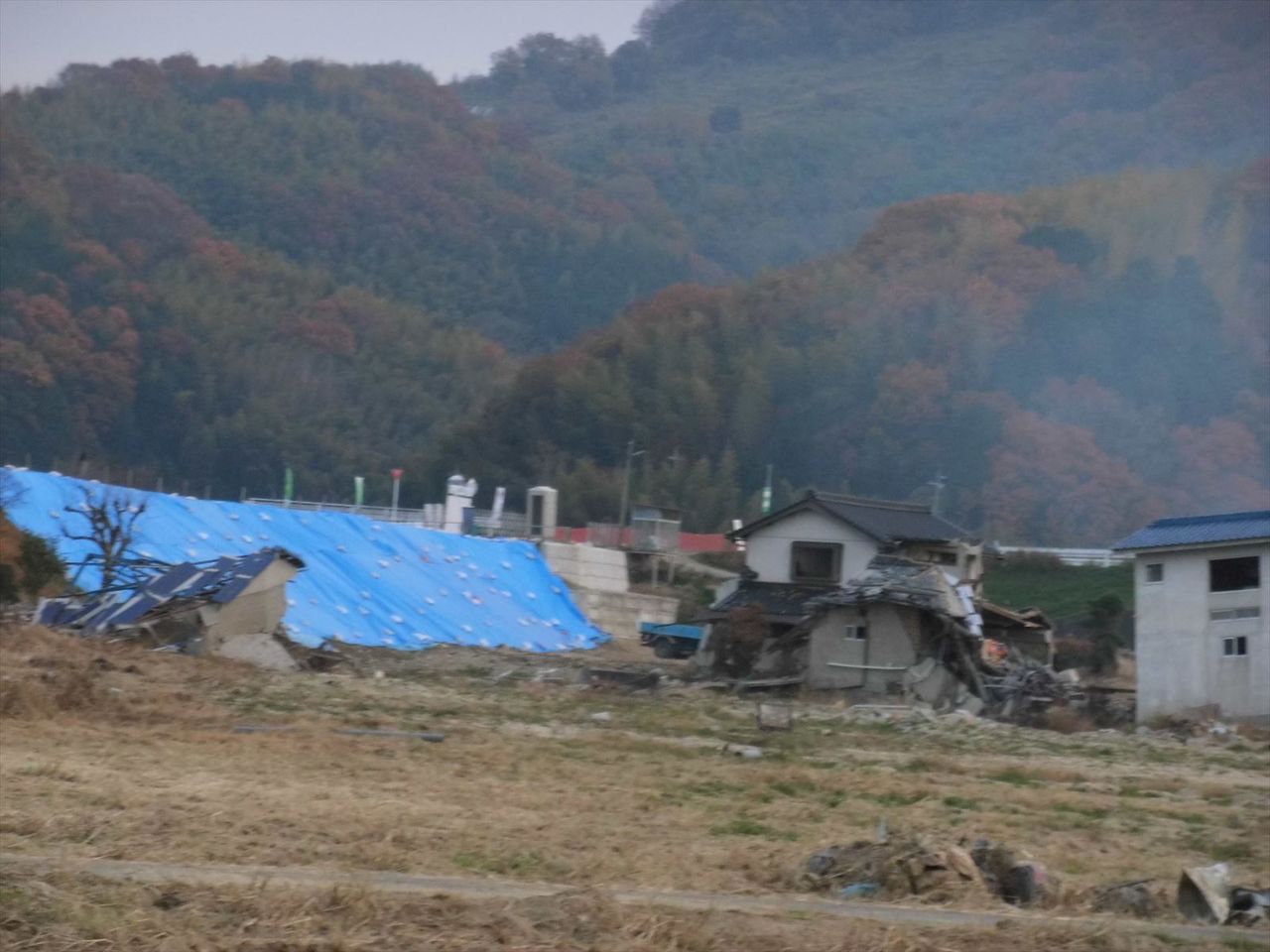 前回作業したお宅近く、姿の良い山並みはすっかり秋の景色。収穫には至らなかったと思われる田の刈り取りも済み、流されてきたのか、稲穂の中に隠れているかのように裏返しになっていたアルミ製小舟も当然見あたりません。