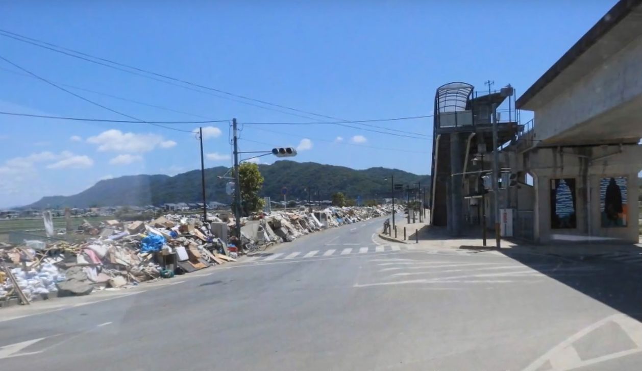 真備町服部地区も一部で浸水。写真のガードレールが見える県道54号線が帰路で、新倉敷に向かって走るが、その途中の低い場所では電柱が傾いたまま。
