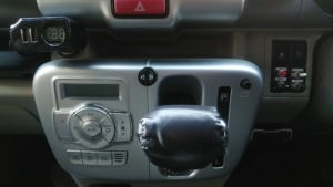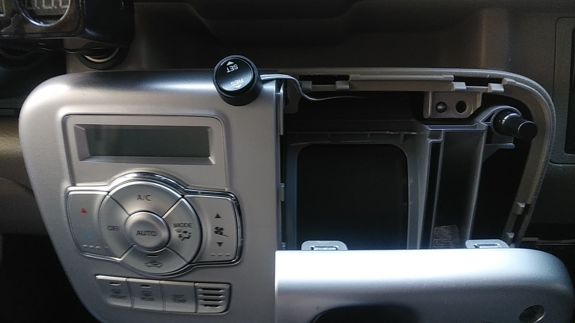 45km/hくらいで市街地走行時、意図せずリモコンの「SET」に指が触れてオートクルーズモードになる事案があり(*_*;、下のようにシフトレバーよりパネルへ移動しました。