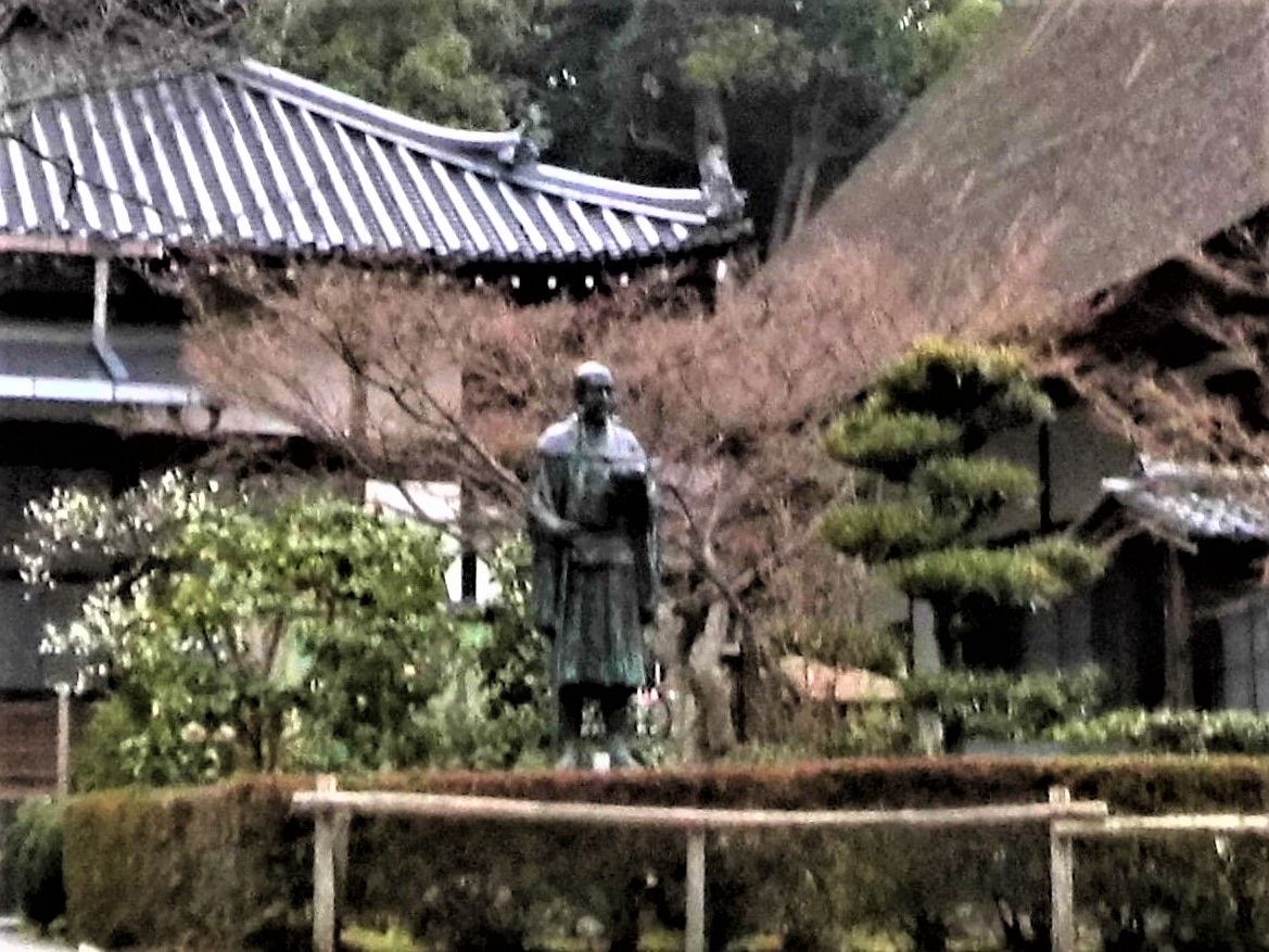 開けた境内の視界に藁葺きのお堂と銅像が見え、まず藁葺きの佇まいに予期していなかった感慨。