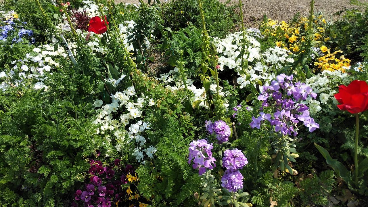 パンジーいっぱいの花籠や花壇は、花の香りが広がっています。