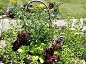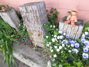 寄せ植えが主体なので、それだけに余計花の種類が多いですね。しかも野草や野菜類もあしらって楽しい!