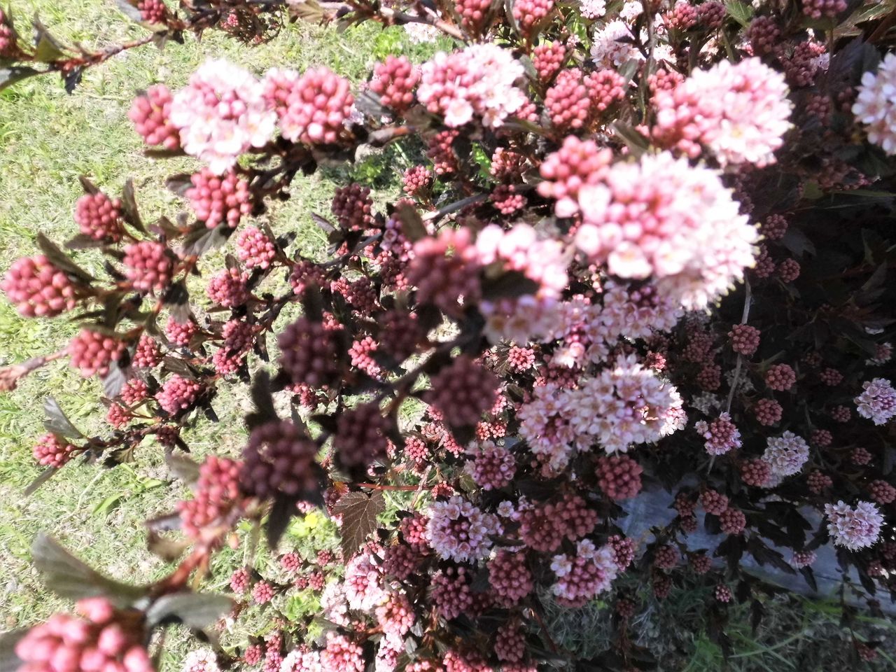 特徴的な3裂の赤茶っぽいの色の葉とコデマリのような蕾と花。品種はディアボロのようですが、ラテン語のその意味は " 悪魔 " だそうです。???