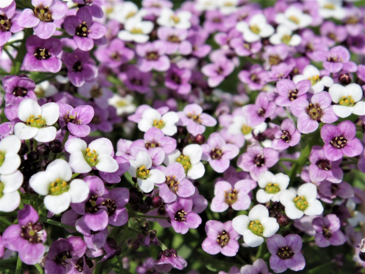 背の高い花々の中でつつましくポットの上にアリッサム。