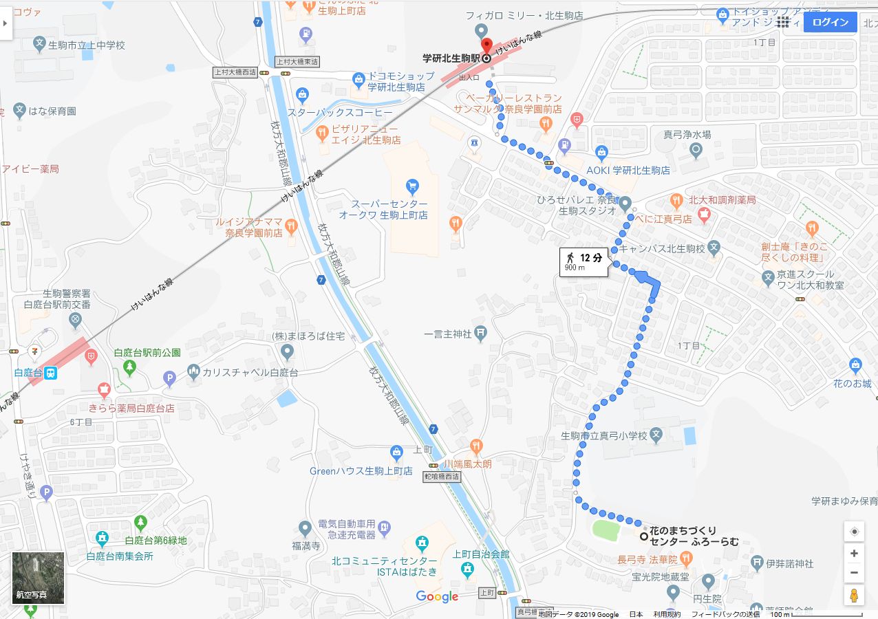近鉄生駒駅で「けいはんな線」に乗り換えて2駅目、「学研北生駒」駅で降りて南方向へ10分程度。