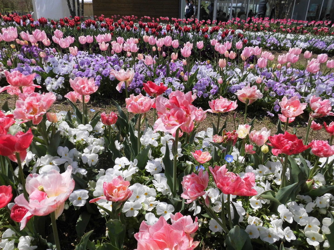 たくさんの種類のチューリップが咲き誇っていますが、そのデザインを他の花々と共に、工夫して植え付けられた園芸の方々に感謝、感謝!