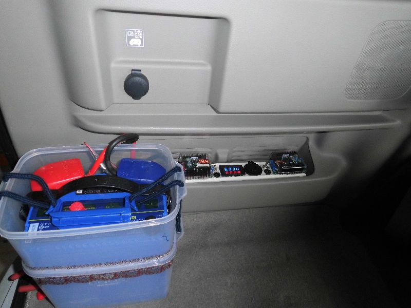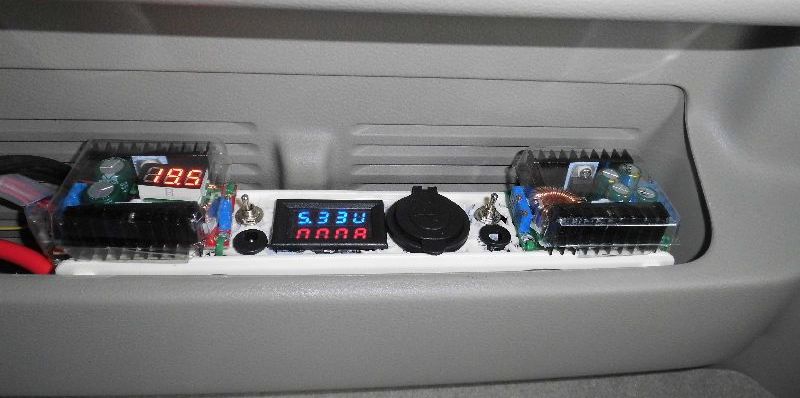 ノートパソコンの電源(19V)用に昇圧DC-DCコンバーター、室内灯等(5V)用の降圧DC-DCコンバーター、そしてスマホ充電用にUSBポート、デジタルメーター、SW、ジャックソケットと、いずれも中国SODIAL社の送料込安価な商品を使用してます。