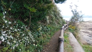 洗い場・休憩所の東屋の立つ「かれい広場」キャンプサイト。この日も、ご夫婦がテントを張り、寛いでおられた。この海側遊歩道を回ると、数分で「くじら広場」キャンプサイトへ。