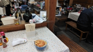 初めて!と申告すると手順を誘導してくれた。ちょっと残念、、でもないが(^^ゞ他の方のブログではいずれもきれいなテーブル席などがアップされているが、写真の通り雑然と物が置かれた帳場?とせわしく動く所員のお嬢さん方を眺めながらツルツル。