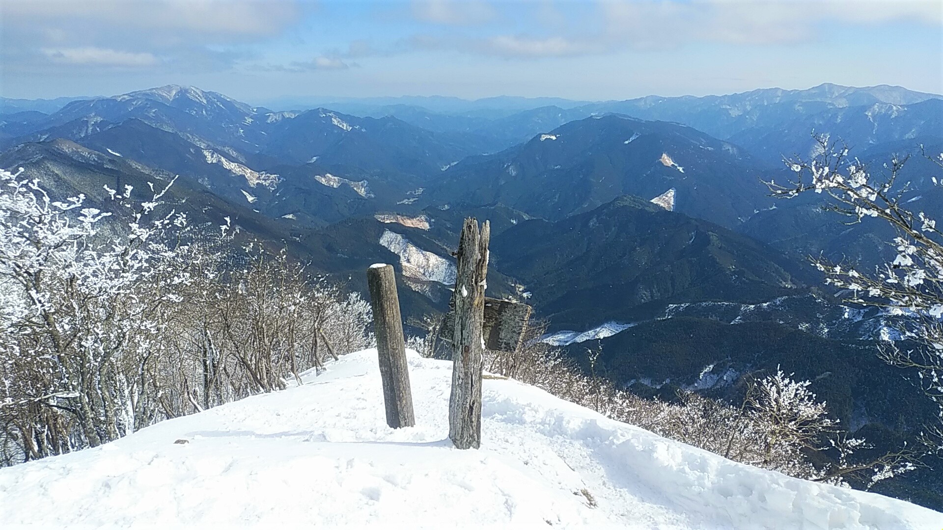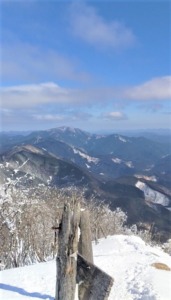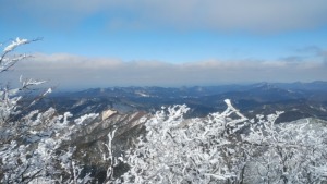 東側に頂きを白く染め、やはり霧氷で知られる三峰山(ミウネヤマ)。