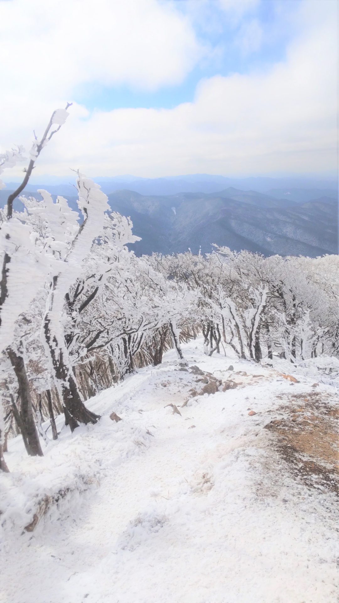 フウ~ウ~💦 正直、体力不足か、、、引き返す思いもよぎったが、休んでいるうちに回復、そして霧氷で化粧した山頂方向を眺めると、やはりワクワク感が増幅!