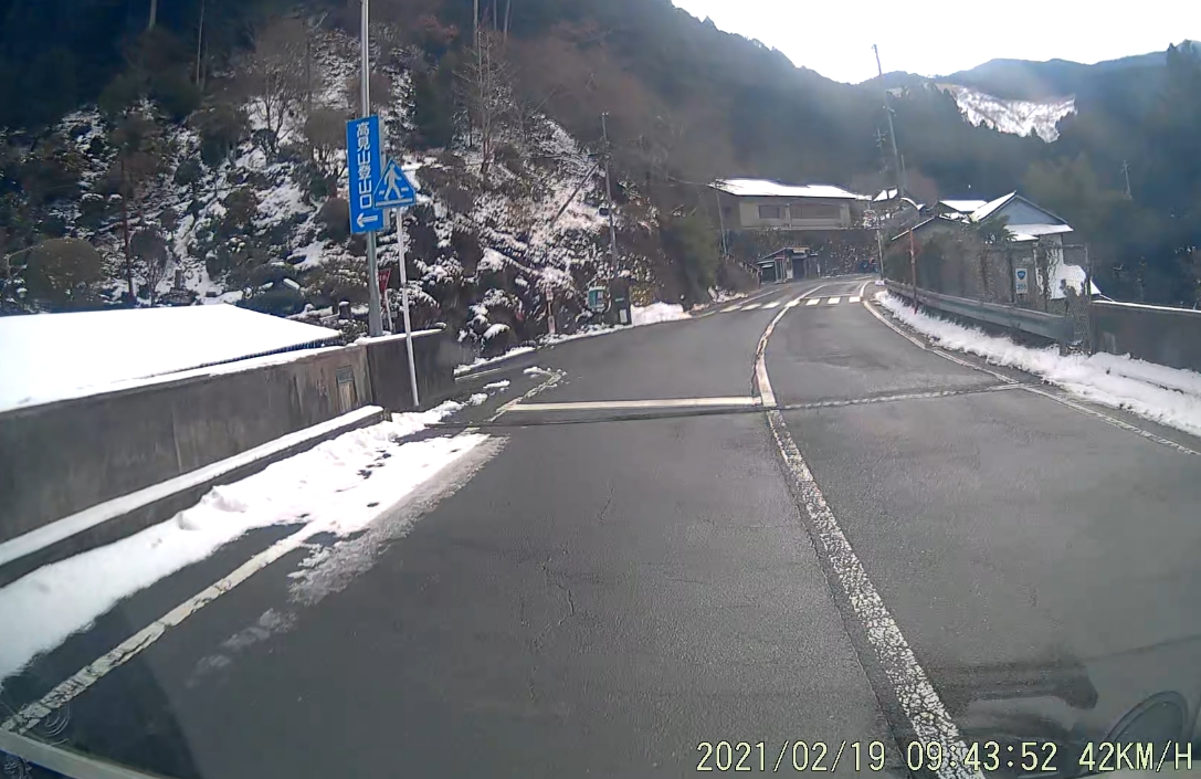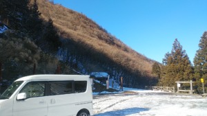 大宇陀の里山を走るに連れて道端や田畑のあちこちに雪が目立ち、日陰の路面にも積雪が見られる頃に「高見山登山口」の案内掲示とその先にバス停。