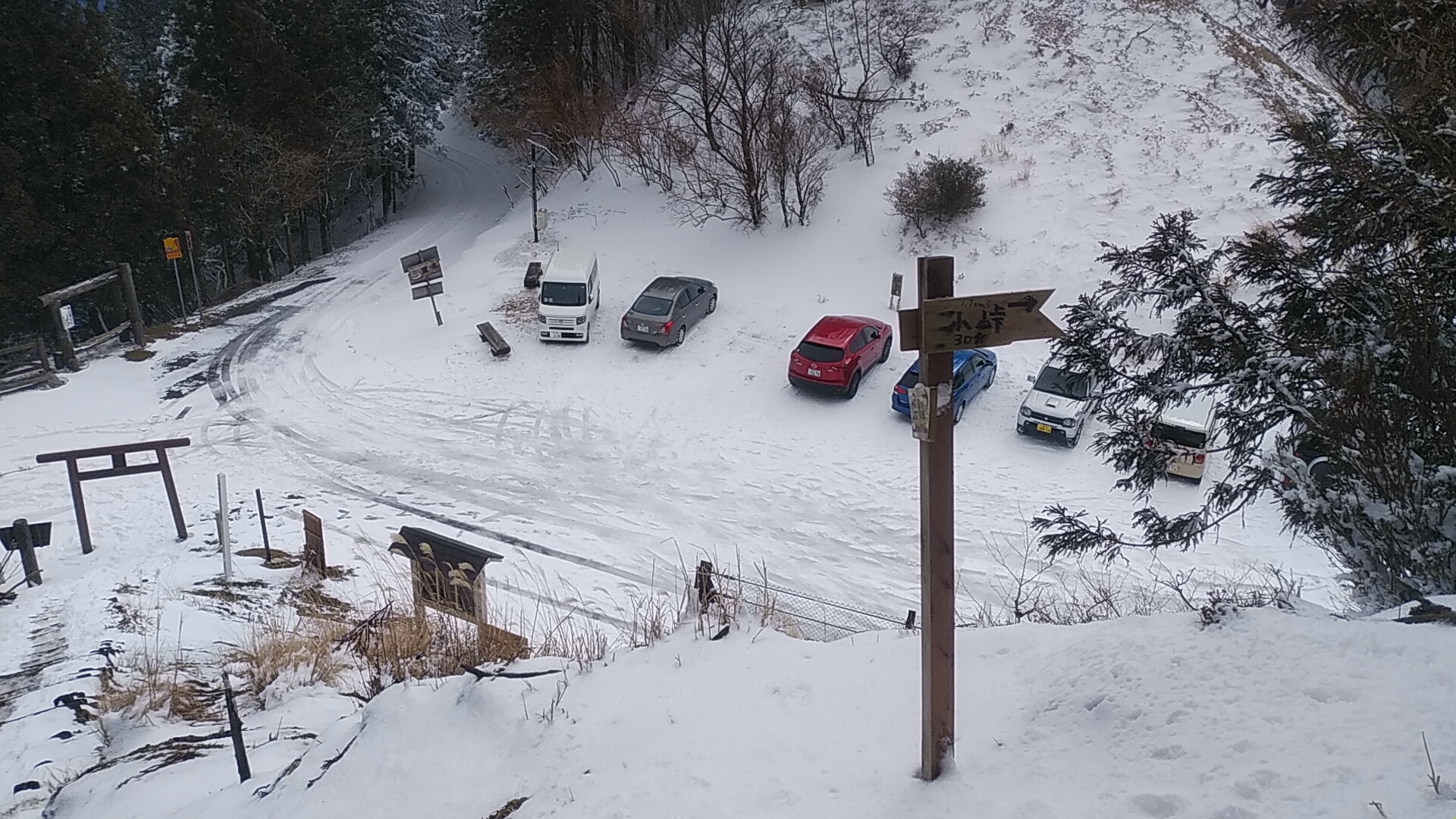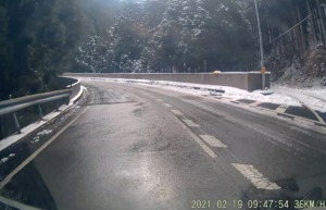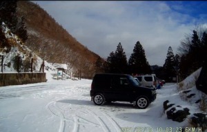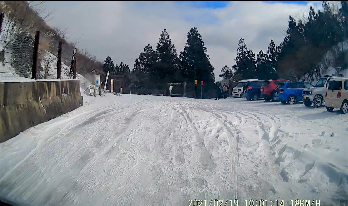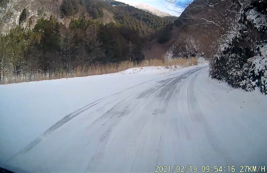 雪道だが、融雪して路面のみえるところもあり、スタッドレスで滑りを感じることもないので、チェーン装着無しで低速走行。