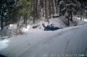 小峠への分岐のヘアピンカーブ、もうこの時間は凍結していないが、早朝は凍結していたのだろうか、、、とも思ったが、冬用タイヤを付けているようだし、タイヤ跡がまっすぐ溝の橋上に向かっているようなので、何らかの錯誤で直進し転落したとも思われる。
