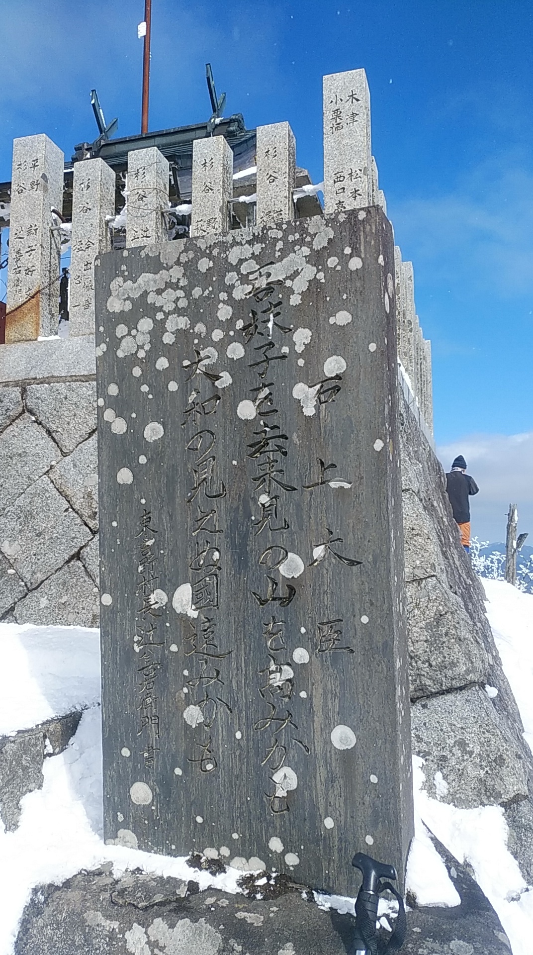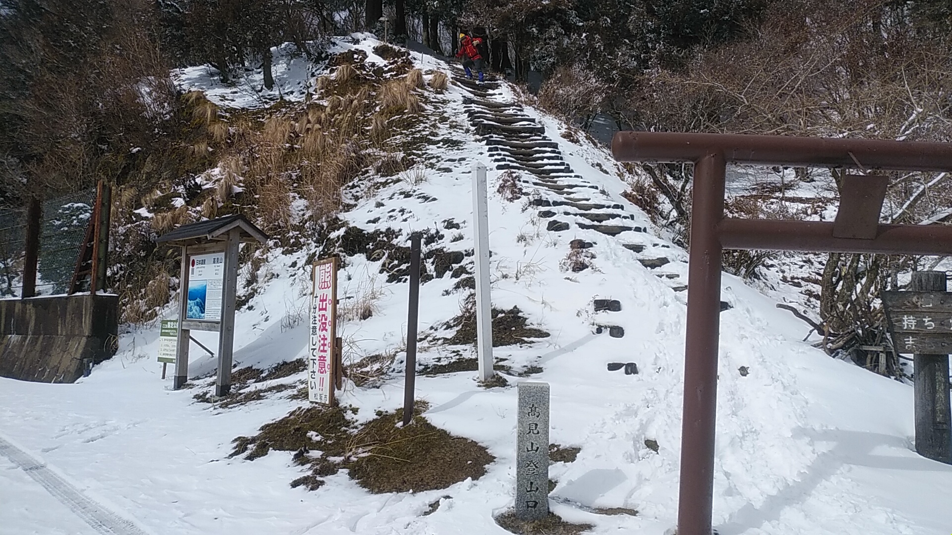 高見山は、頂上に高角神社が鎮座する霊なる山。その登拝口の鳥居なのか、はたまた木段を登った先になにか石塔(墓標?)があるのでそれと関係するのか。鳥居額の字がよく読めないが、ともかく一礼して登リかけると、もう降りてこられる方が、、、。