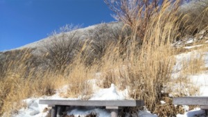 スパイクが効いて楽には歩けるが急坂が続き、次第にちょっとしんどい(-_-;)な、、、と感じ出した頃、ベンチの設置された展望広場に。