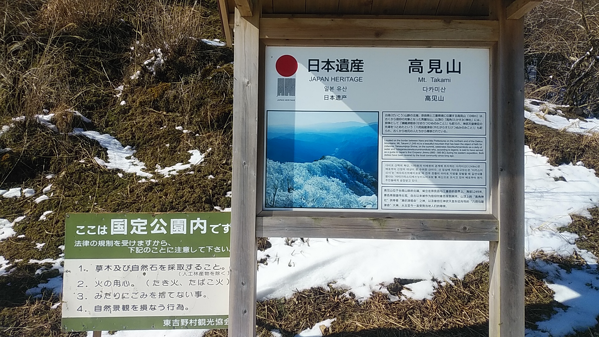 登山口手前に、国定公園内の禁止事項掲示と、日本遺産認定で四カ国語の説明掲示。