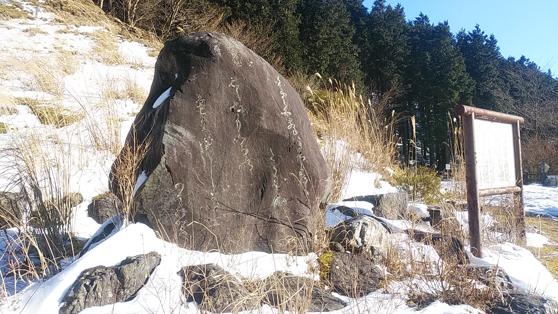 * 駐車場に江戸時代の医者で国学者「本居宣長」が、 国学を講じるため紀州藩主のもとへ出府した際、高見山を越え東吉野村で思いを詠んだ歌の石碑。(右手の解説より抜粋要約)