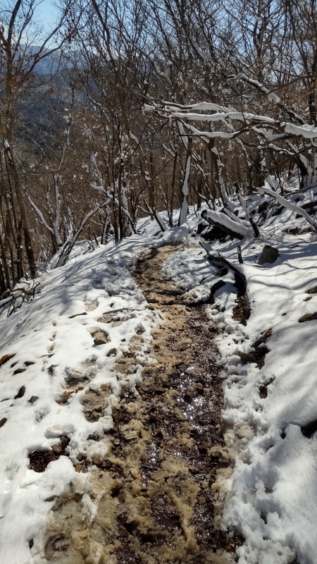 🔹峠に近づくにつれベチャベチャ、雪解水が陽光に煌めく✨。