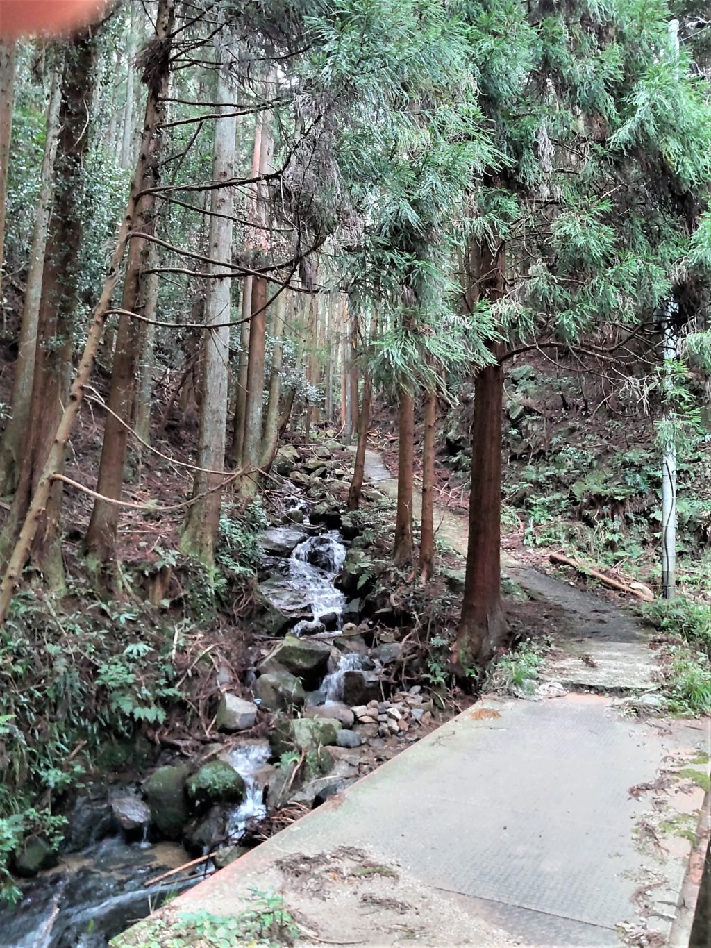 仏像や梵字の石柱が祀られている大樹を巻くように上り行くと、一段と急坂…。滑り止めを施したコンクリート急坂だが、ここで転ぶと、とても痛い目に遭うだろうなあ、と慎重に…。