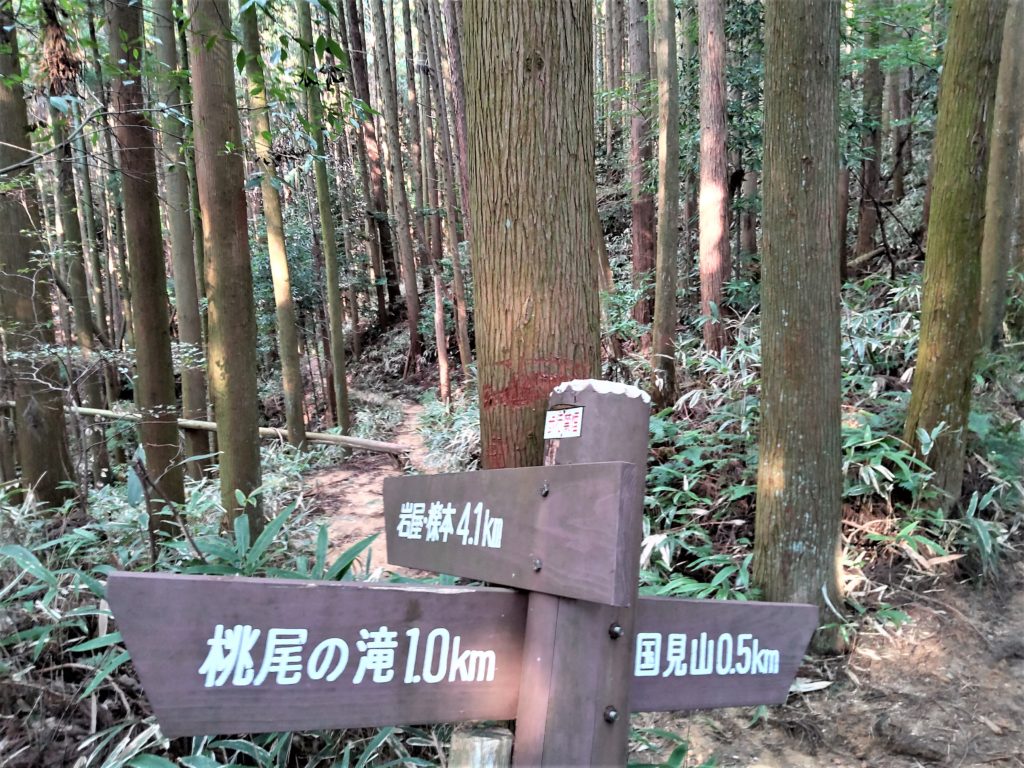 画像、中央から下方の左寄り天理東ICを出て右折、少し走ると天理教の本部施設群…2つ目の交差点を左折してカーブの多い集落の道を登り行き、更に小さな滝案内道標で左折、分け行った細い道の先に名瀑「桃尾の滝」…その瀧前広場の左側、登山案内看板の立つ所が、「大国見山」への登山道入り口。