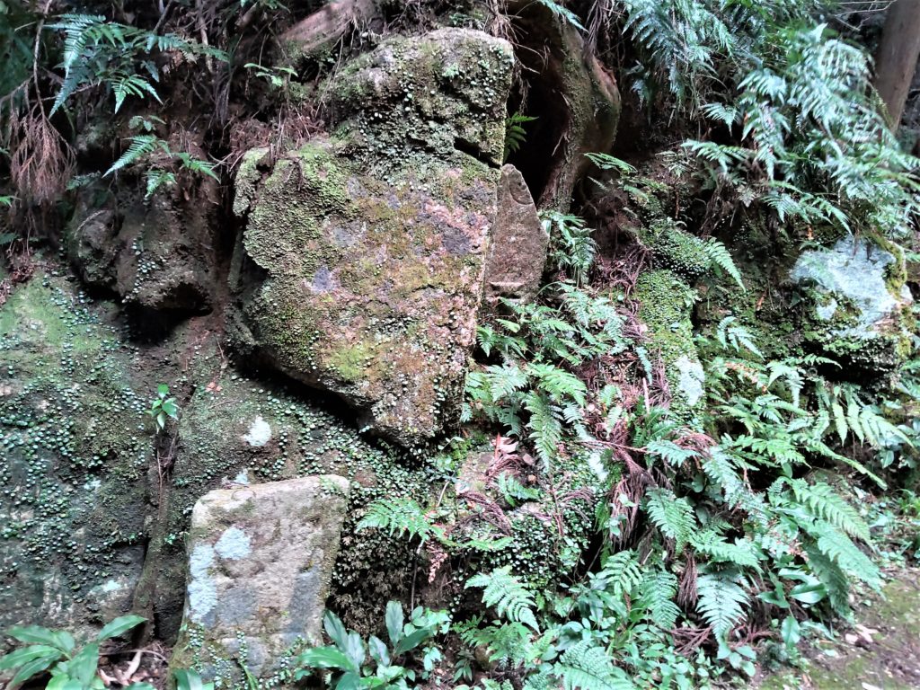 コンクリ道へ戻って下り行く先、小川の山側に板碑石仏と仏様の彫られた巨岩…