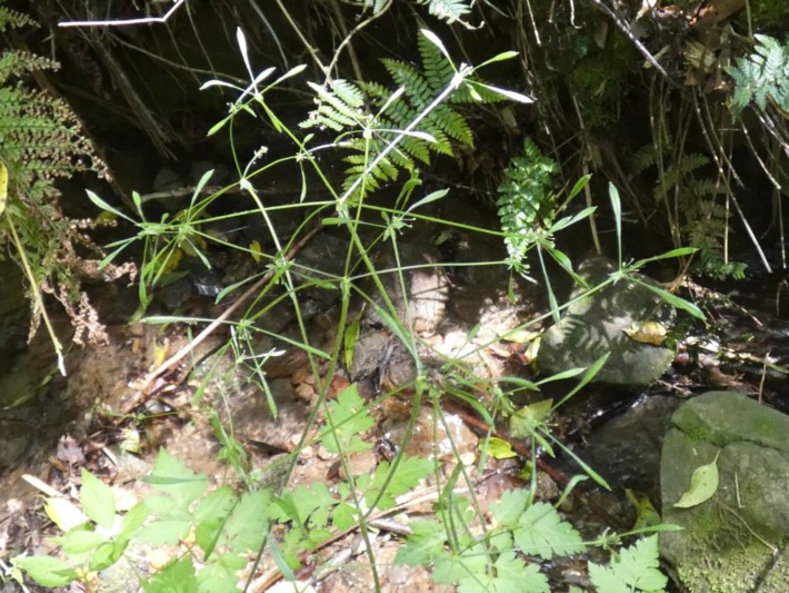 葉はニンジンみたいで、複散形花序が線香花火のよう広がる先に、プロペラ様に果実を付けて…