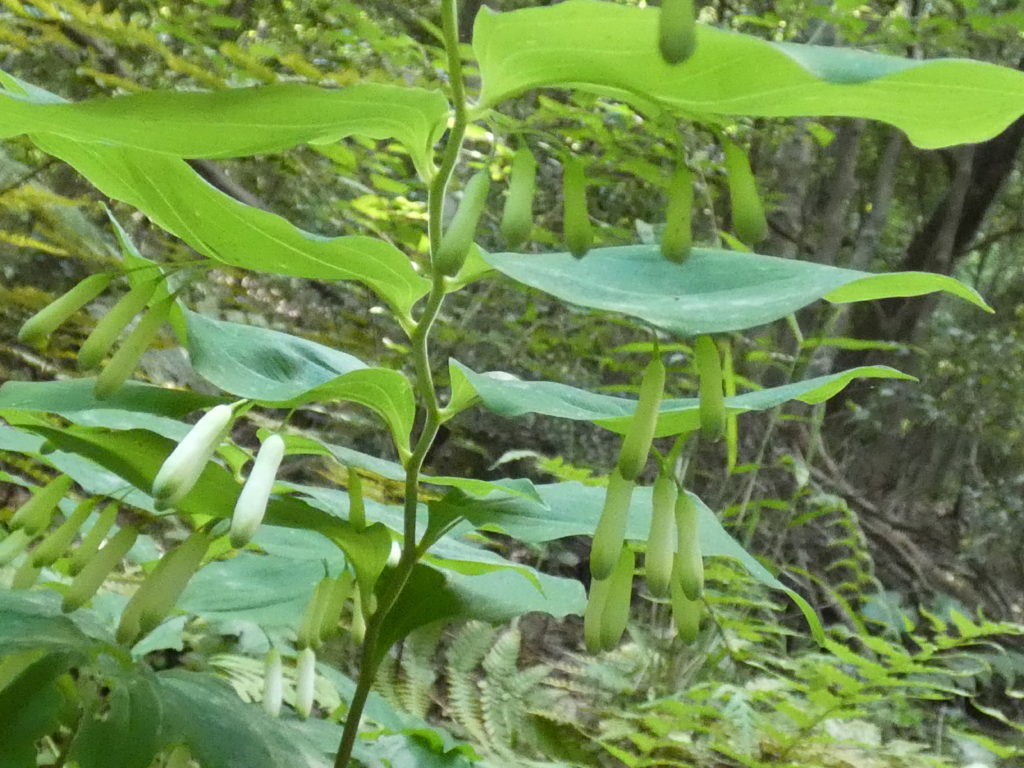 あれ?葉は丸っこく、茎はツルッとしてなくアマドコロみたいだけど、花の姿はナルコユリ…