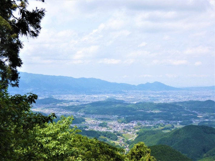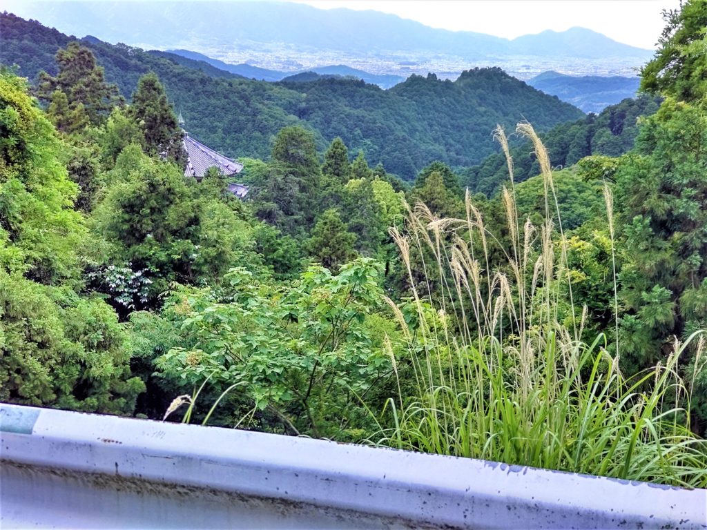 県道から壷阪寺八角円堂(本堂)の屋根が垣間見え、向こうに葛城方面の眺望…