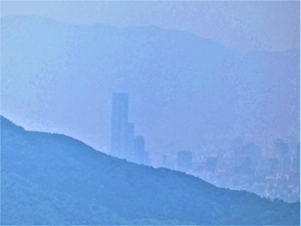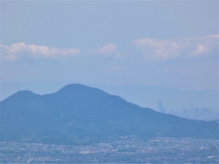 二上山雄岳の山裾はるかに…ハルカスとビル街…その向こうに六甲の山並みが、蜃気楼のよう…。
