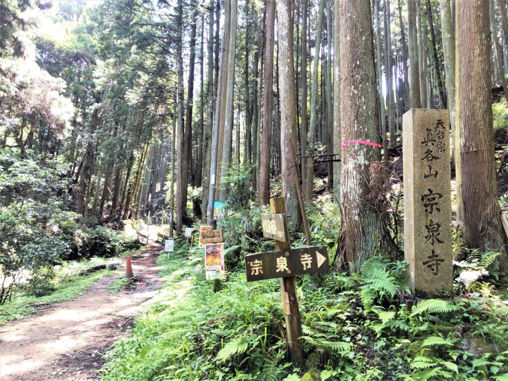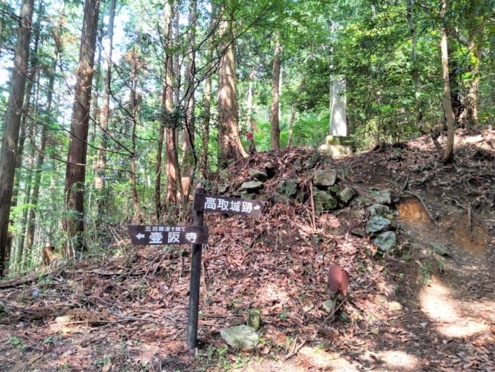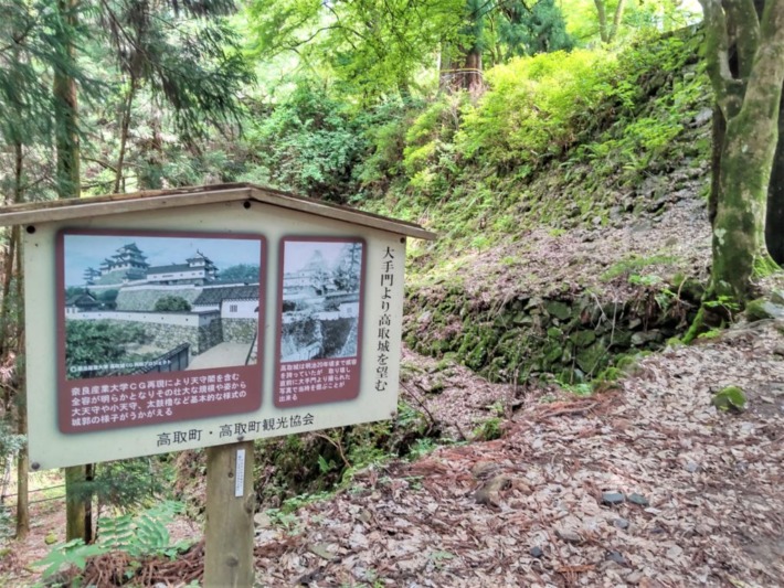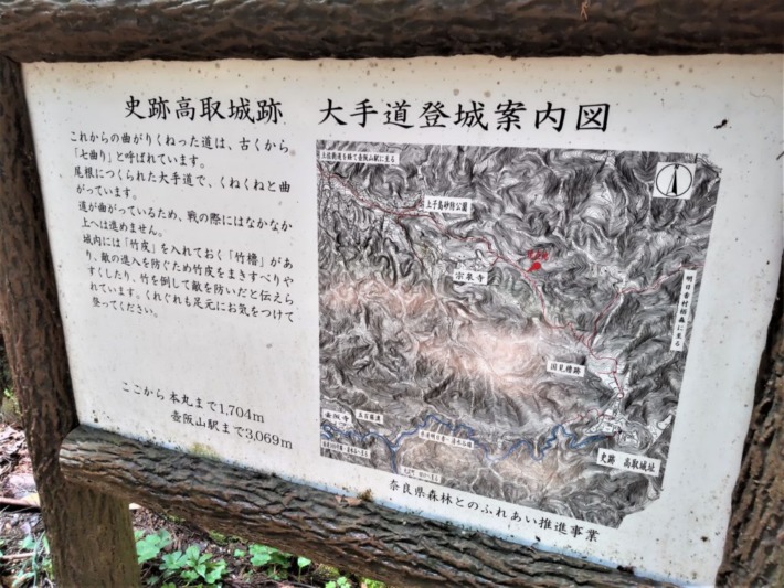 🔹高取藩主植村氏の菩提寺「宗泉寺」への車道と別れて、登城道へ…"この先史跡内の為自転車・バイク進入禁止"の立て札あり。
