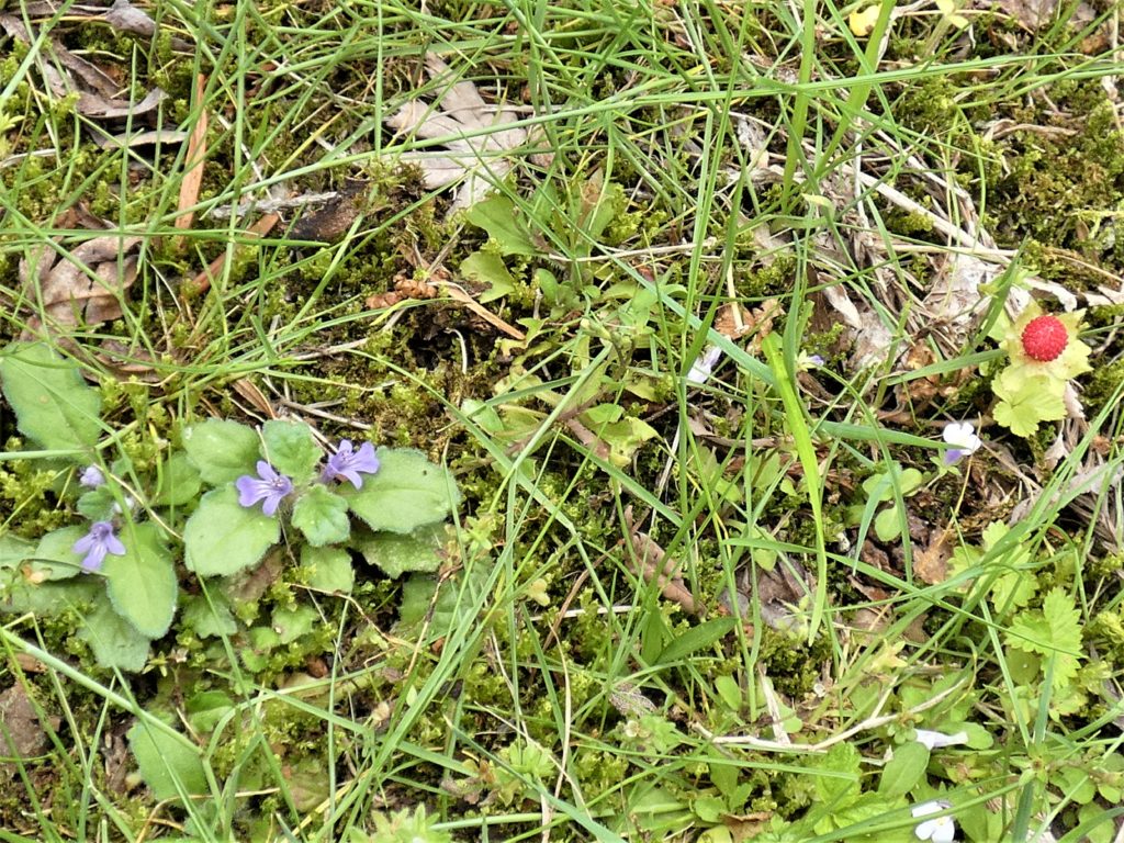 葉も花も色が淡いがキランソウ、赤い実のヘビイチゴ…