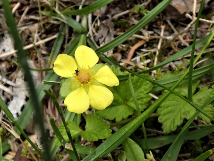 実を膨らませ始めたヘビイチゴなど小さな花園を楽しむ。