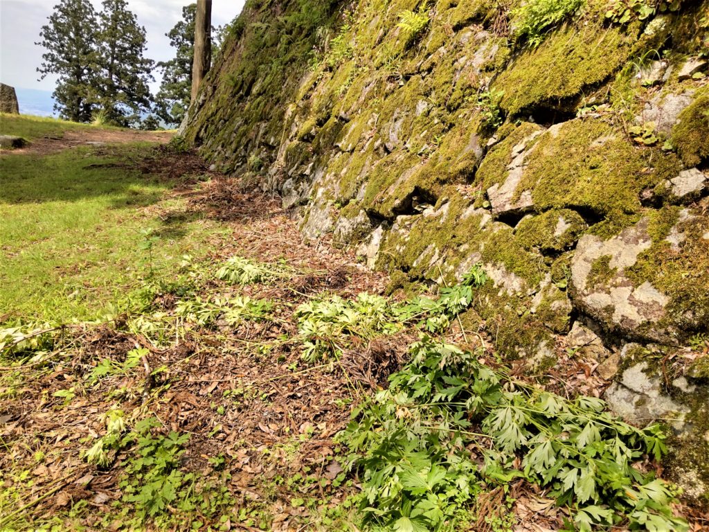 苔蒸してユキノシタがたくさん花咲かせている、天守台の石垣を巻くように…