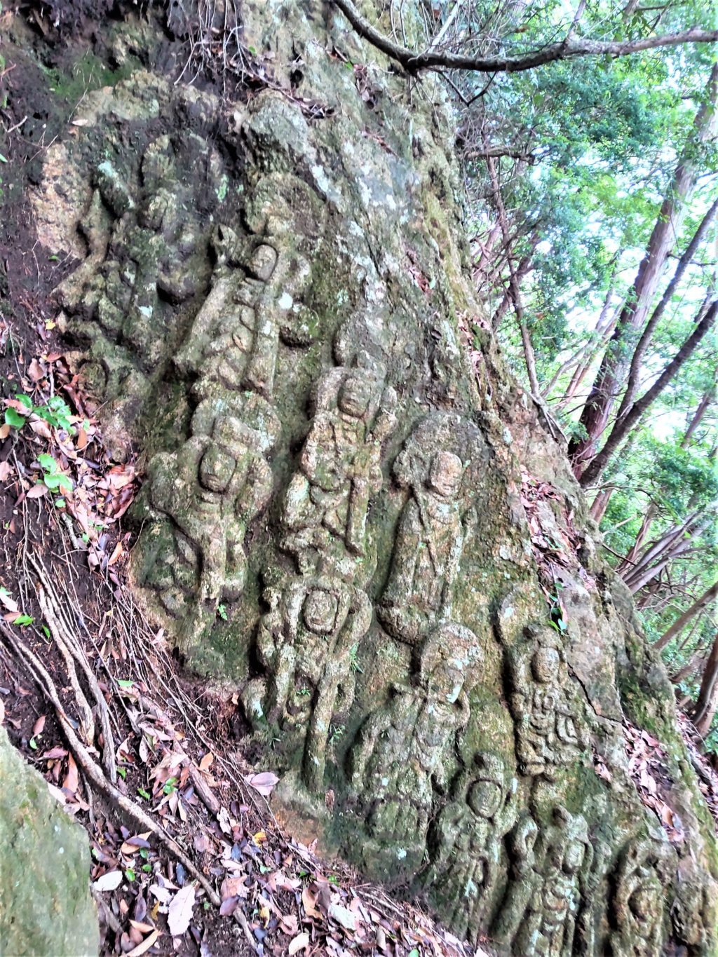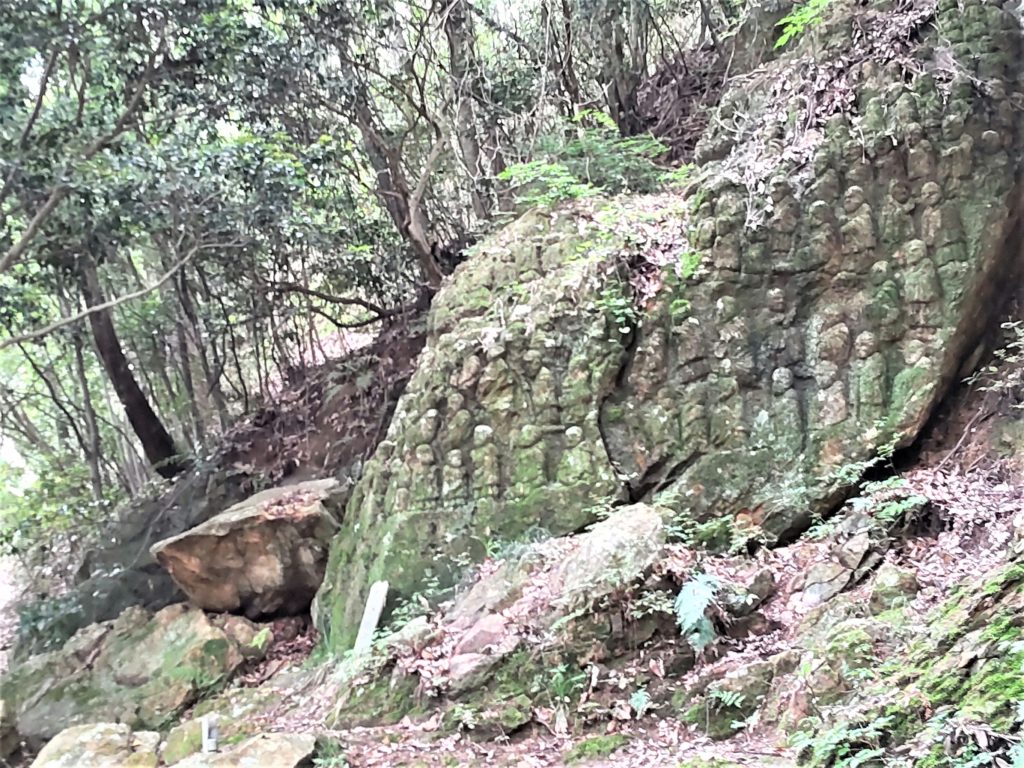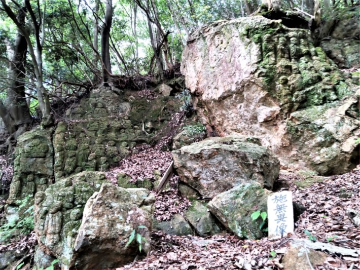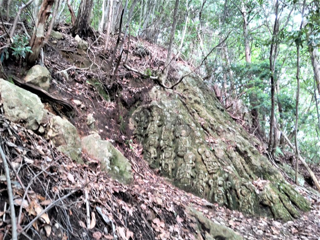 高山の大きな岩のあちこち、露出した岸壁ほぼ全体に石像…