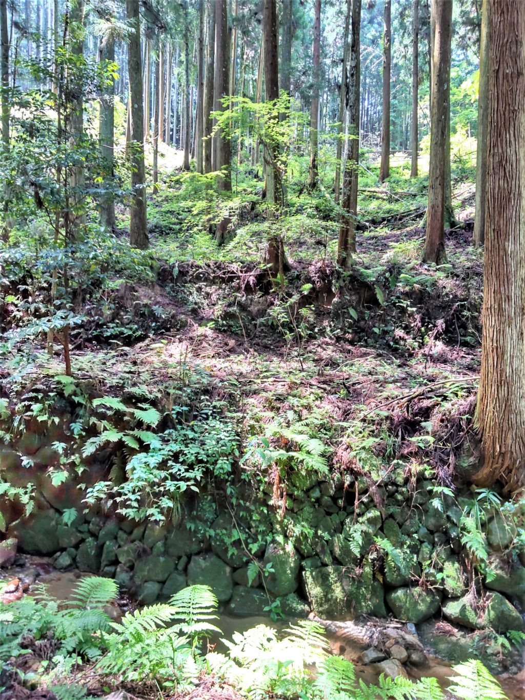 立札の川向かいに、棚田のように石垣が積まれた削平地(郭)跡らしき段々…。