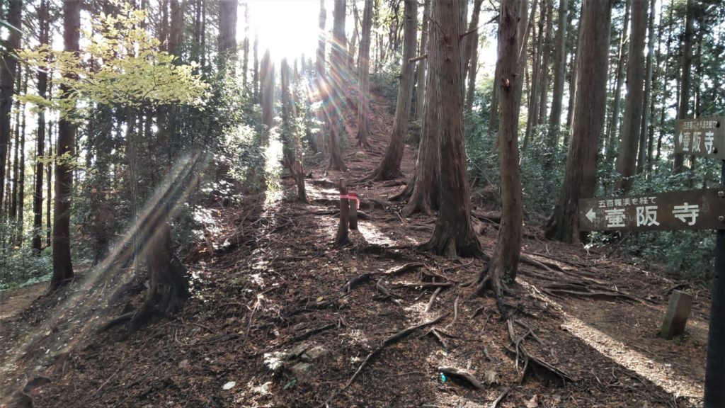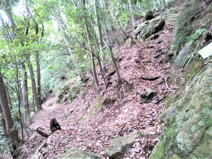 五百羅漢周遊道」となっているが、急坂の続くこちら側はあまり通っていないのか、落ち葉が深く積って滑りやすく、浮石にも注意が必要…