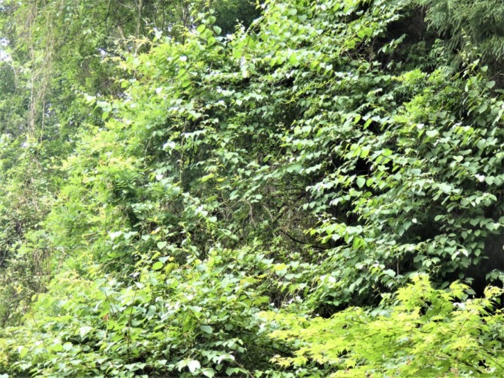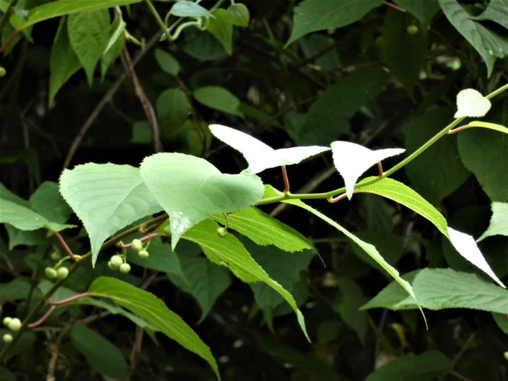 車道の山腹はマタタビの蔦で覆われている… マタタビの白化は、" 葉の表層に空気が入り込み、光を反射して白く見えている “だけ~なので、画像のように光の加減であまり白く見えないときも…。
