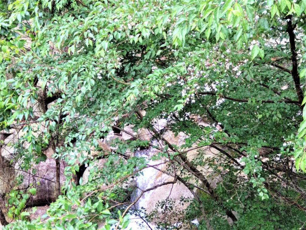 ガマツカの花咲く右側枝先の向こう、奥にちらっと覗く岩場…あの辺りまで行ったのかな…。