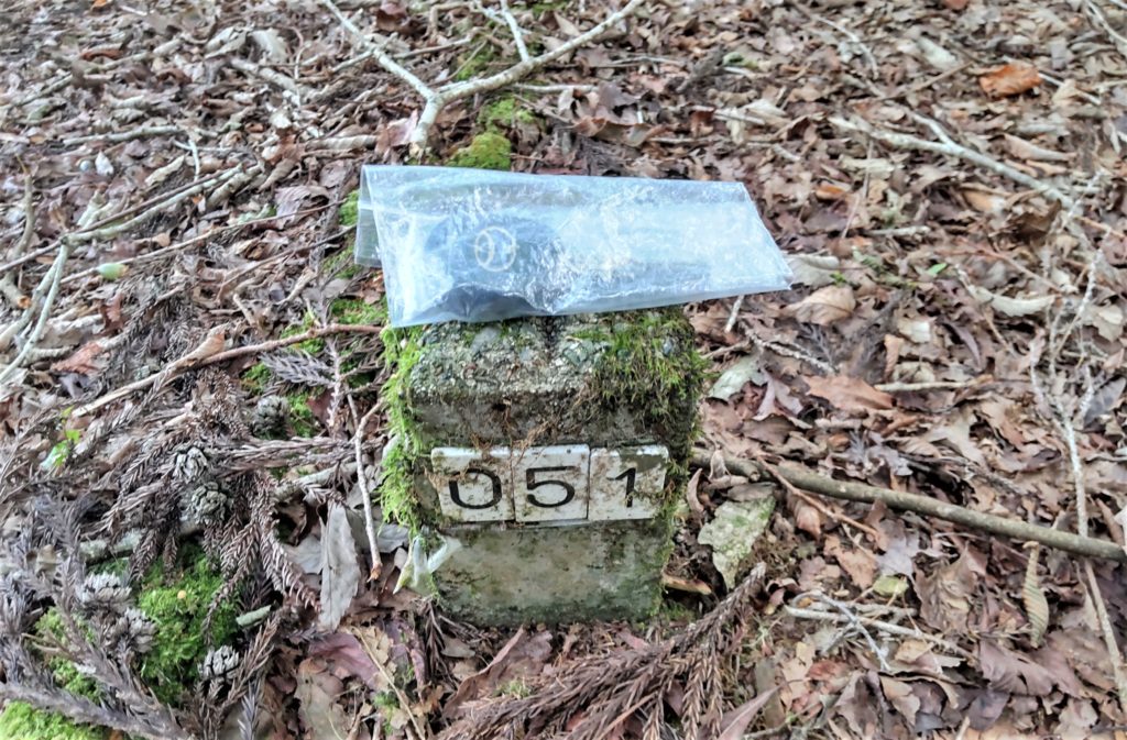 どなたかが見つけて木株の上に置いたのか…自分も二上山でキーを落として翌日登り、馬の背の🚻入り口にかけてくれてたのを回収できた経験から、袋に入れてそばの標識の上に置いておくことに…