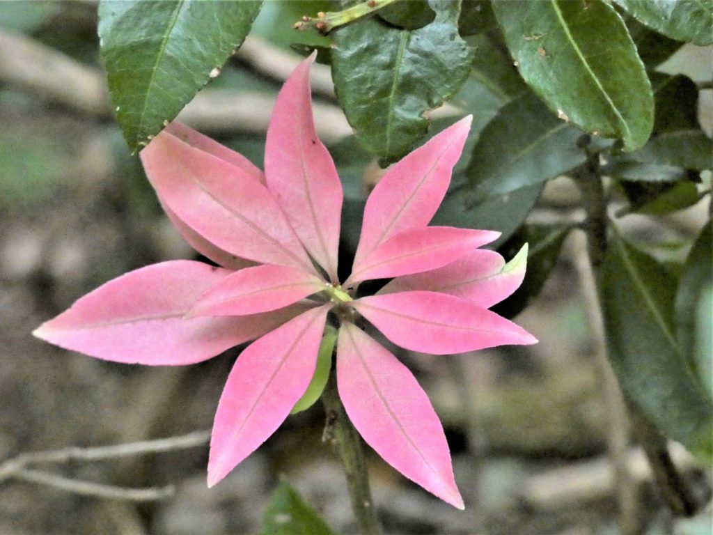 🔹鹿の鳴き声がした…..鹿の食べないアセビ(馬酔木)が繁茂しているかと思ったが、意外に登山道沿いには背の高いアセビは少ない…偶に見かけた新葉が、花のように美しい!