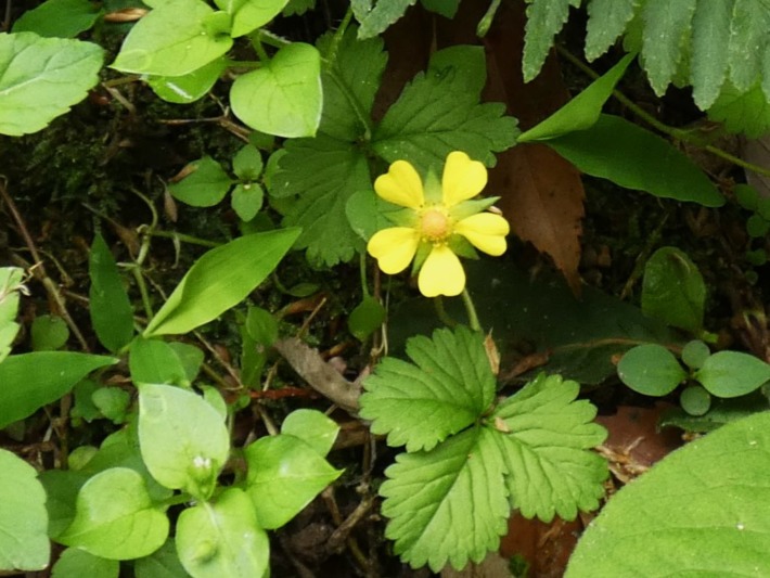 💛型花びらが果実を囲んだヘビイチゴ(蛇苺)を眺めては休みやすみ…