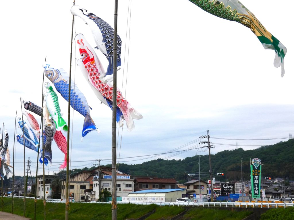 土手に並ぶ鯉のぼりの向こうに、"夏秋期日本一 平群の小菊"の看板